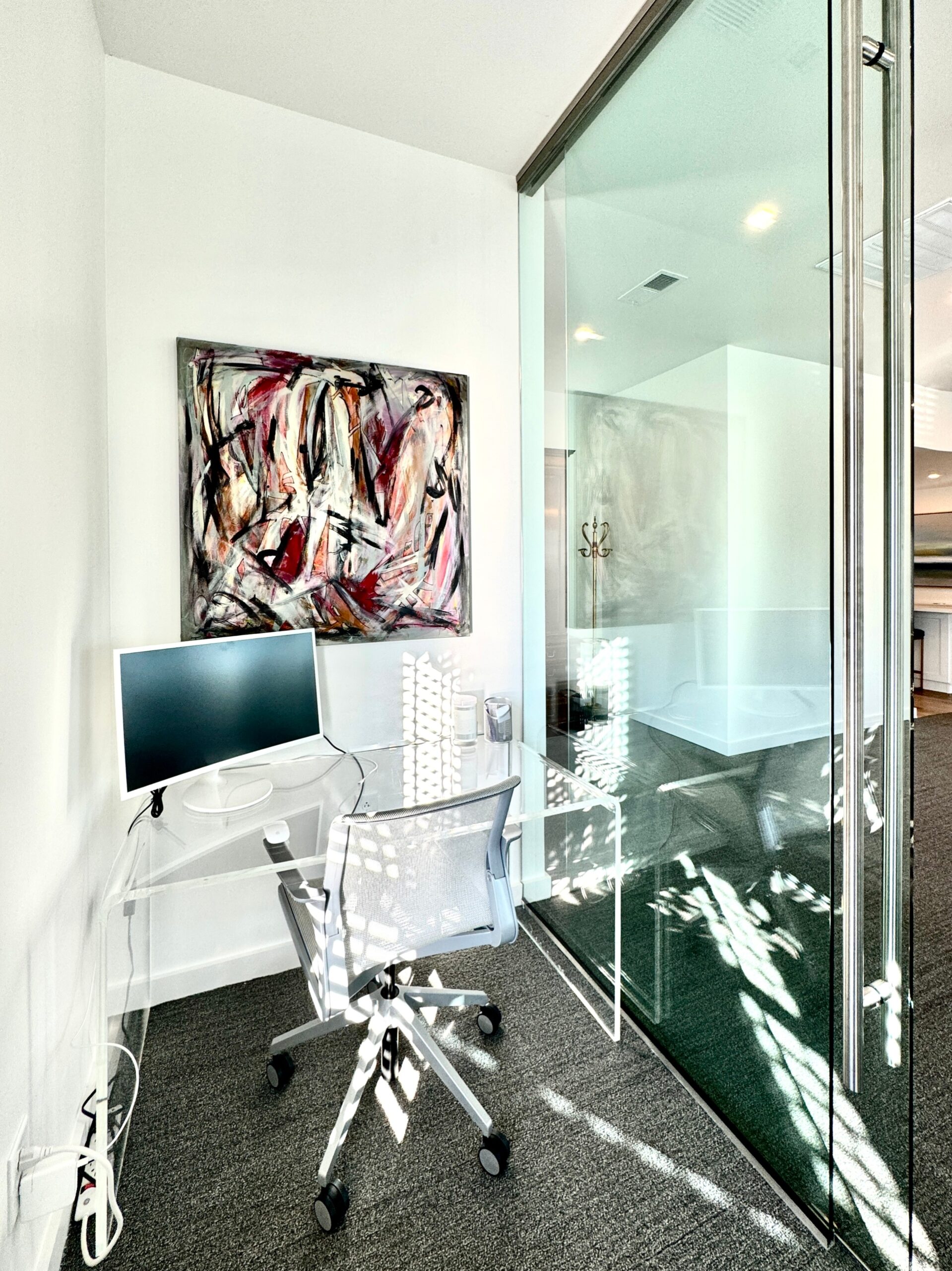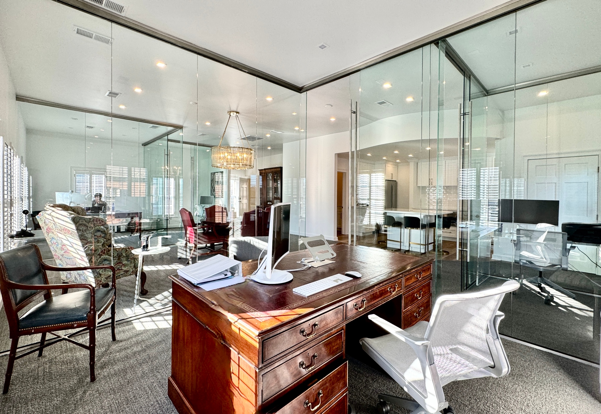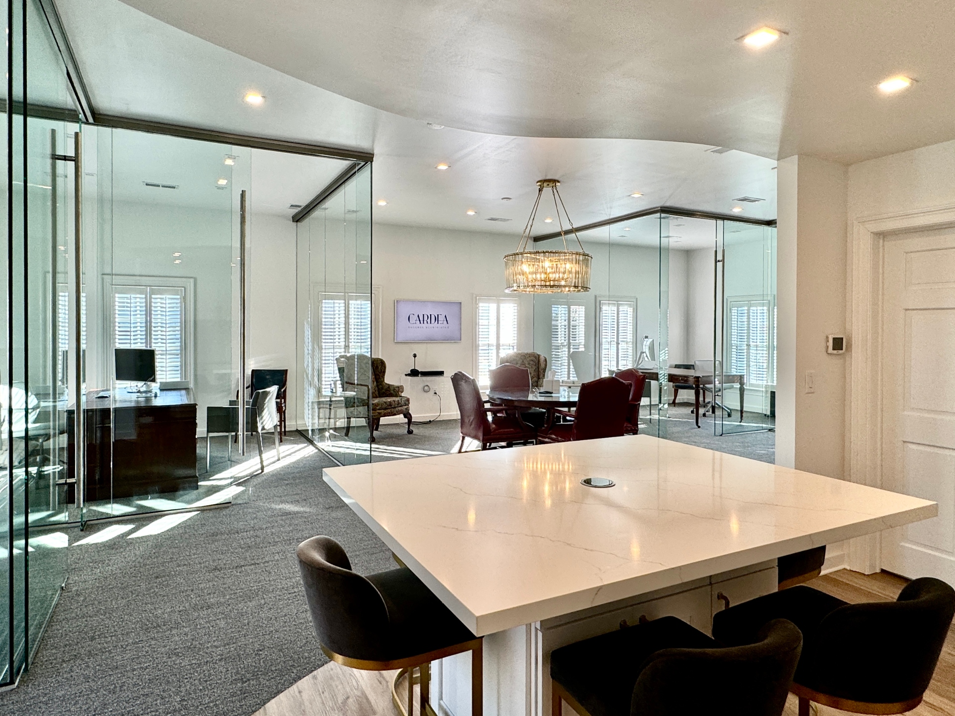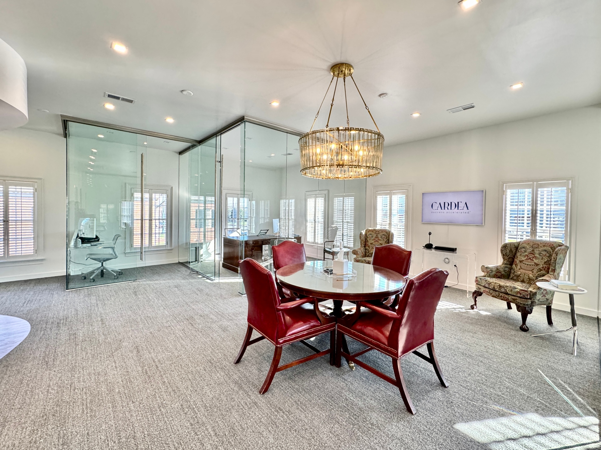 The Cardea Group in Charlotte is a leadership and business consultancy accelerating success for leaders, teams, and companies through executive coaching, strategic communications, and organizational transformation. Led by Mary Dowd, they offer expertise in growth environments, culture shaping, and digital/traditional comms, focusing on empowering executives, developing talent, and navigating complex business changes. They provide tailored solutions for leadership development, career transitions, and building high-performing cultures, known for their industry insight and result-driven approach. Their warm, bright, and inviting office suite is enriched with glass for that open, and airy feeling. With a dreamy office suite like this, who would want to go home at the end of the workday?