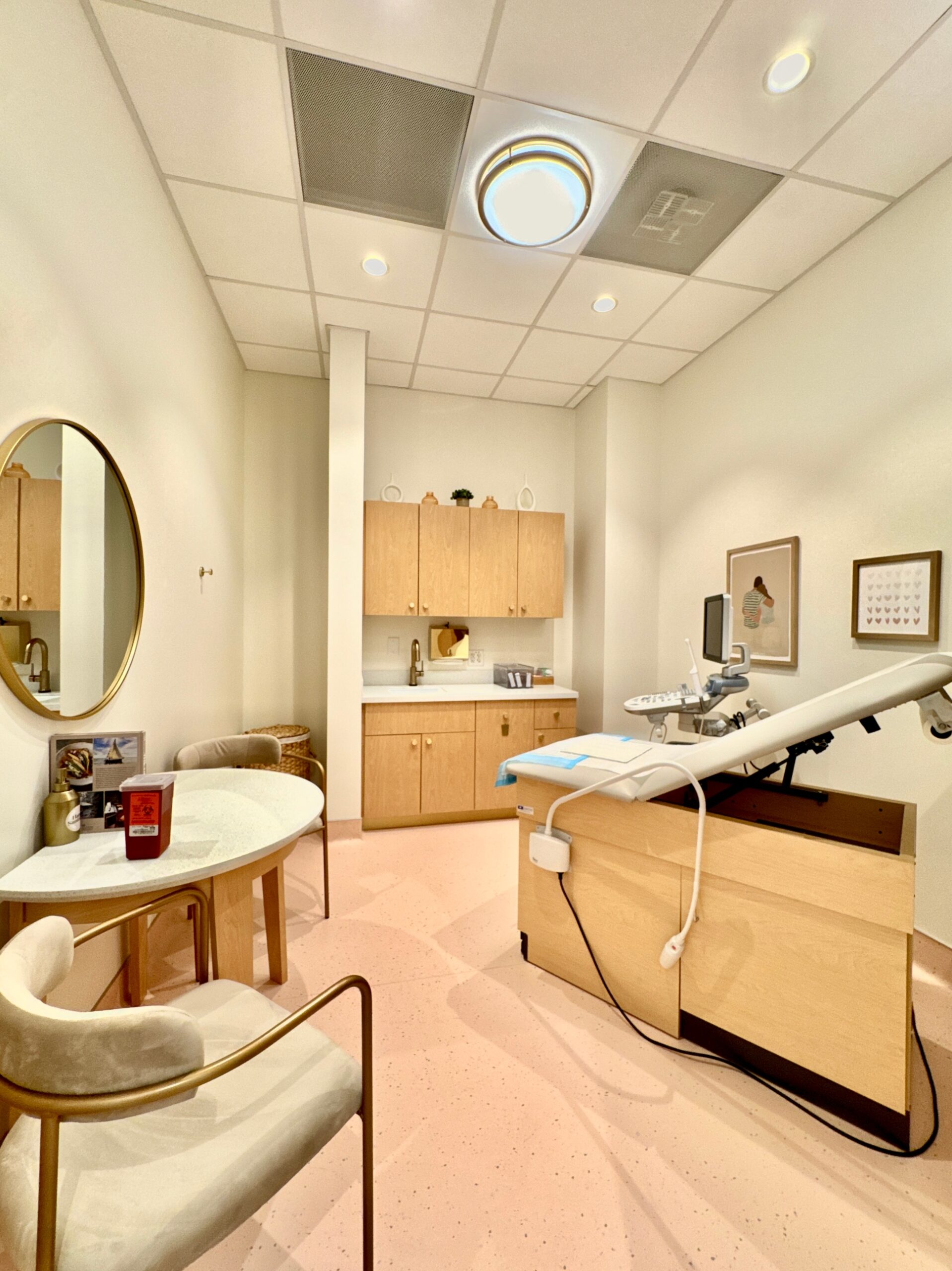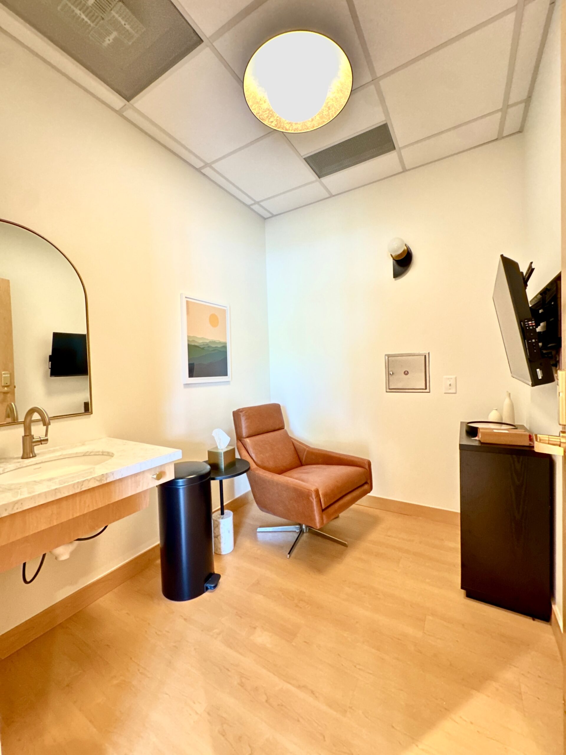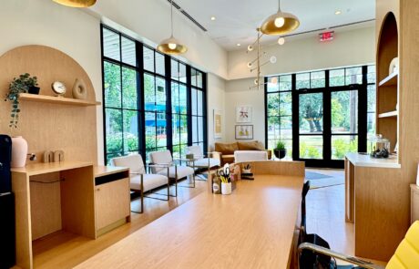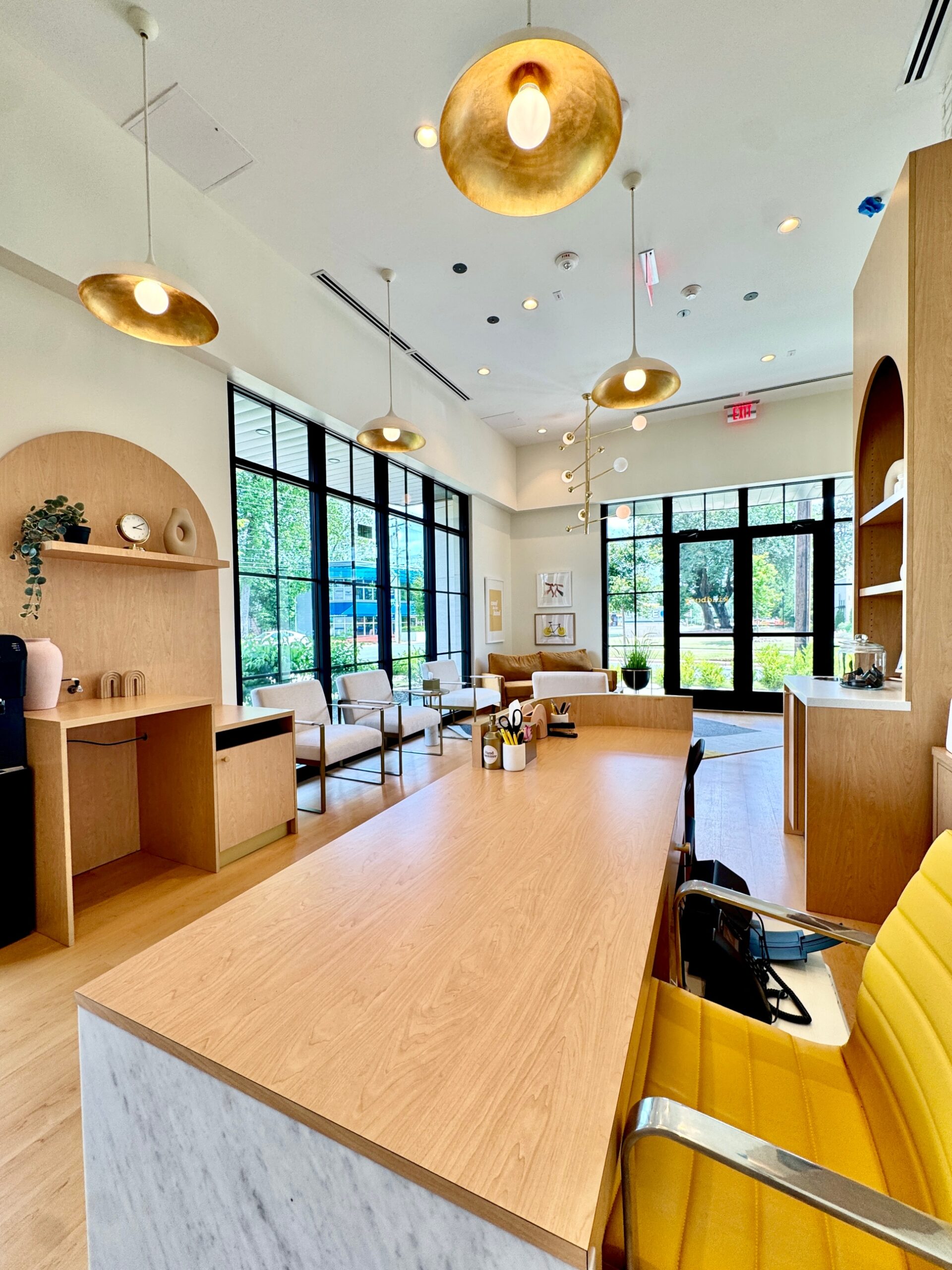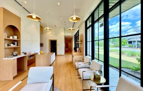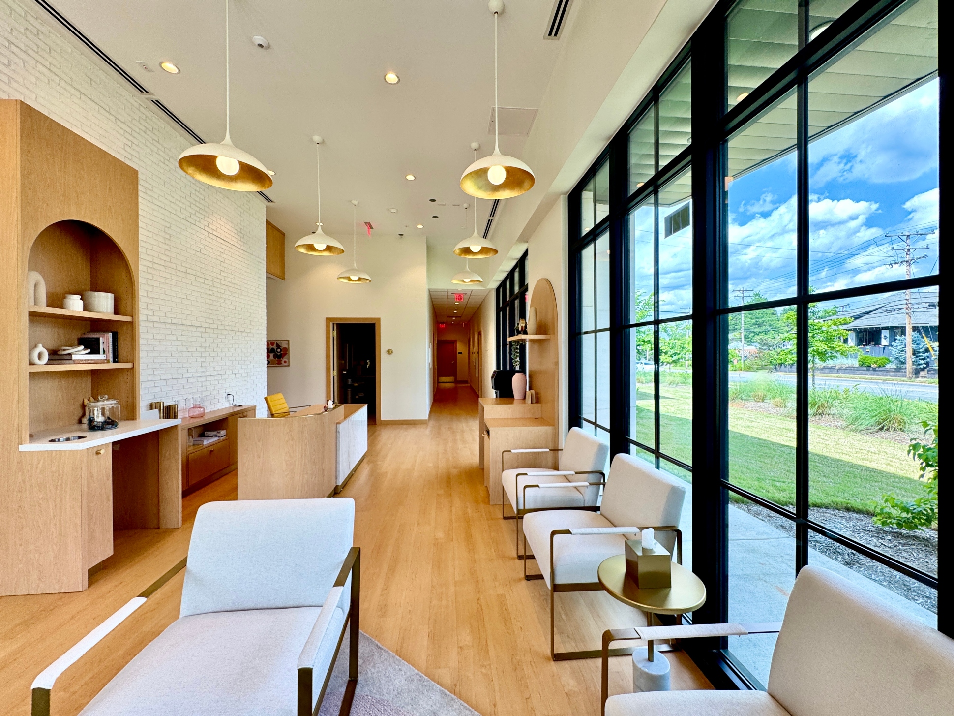 The Kindbody facility in Charlotte, located in a one-story building at the intersection of the historic Myers Park and Eastover neighborhoods, is designed to feel more like a chic, comfortable hangout than a traditional medical clinic. The goal is to create a welcoming and less intimidating environment for patients. The clinic is situated in a community-centered district known for tree-lined streets and stately homes. The building itself is a modern, 5,126 square-foot office space that blends into the professional yet inviting neighborhood aesthetic.